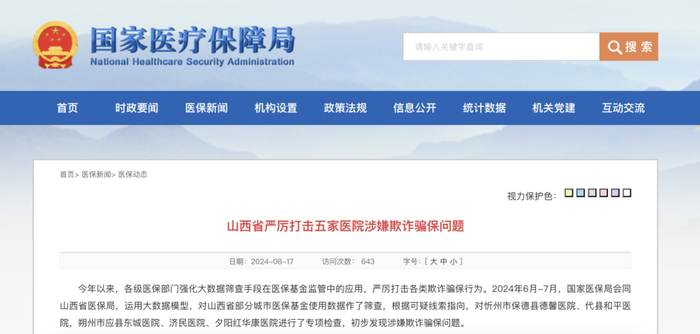 8月17日,据国家医保局官网消息,2024年6月—7月,国家医保局会同山西省医保局,运用大数据模型,对山西省部分城市医保基金使用数据作了筛查,根据可疑线索指向,对忻州市保德县德馨医院、代县和平医院,朔州市应县东城医院、济民医院、夕阳红华康医院进行了专项检查,初步发现涉嫌欺诈骗保问题。