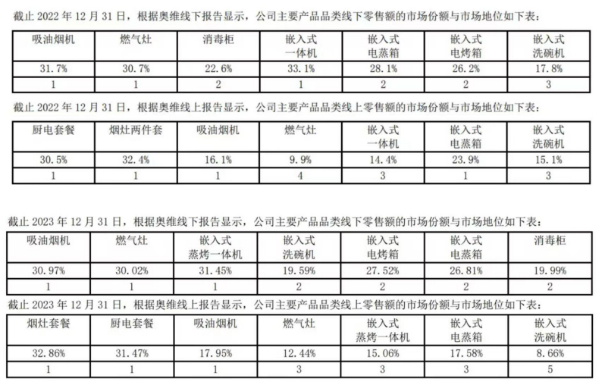 据奥维线下报告显示,2023年,公司的吸油烟机、燃气灶、消毒柜、嵌入式电蒸箱的市场份额均出现了不同程度的下滑,分别下滑了0.73个百分点、0.68个百分点、2.61个百分点、1.29个百分点。