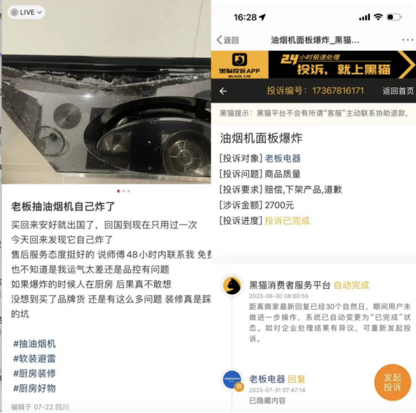 其次,老板电器的口碑是在下滑的。早在2020年,老板电器曾因燃气灶爆炸事故,被判赔偿用户近30万元。在该事件之后,关于老板电器产品爆炸的情况仍在发生。证券之星注意到,今年7月份,有消费者称,其购买的抽油烟机突然自爆。而在此之前的2023年及2022年,也有多起老板电器爆炸事故发生。