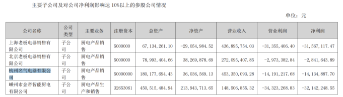 除了上述两家子公司之外,金牌电器另外两家重要的子公司--上海老板电器销售有限公司(下称上海老板)和北京老板电器销售有限公司(下称北京老板)也出现亏损。