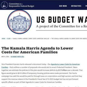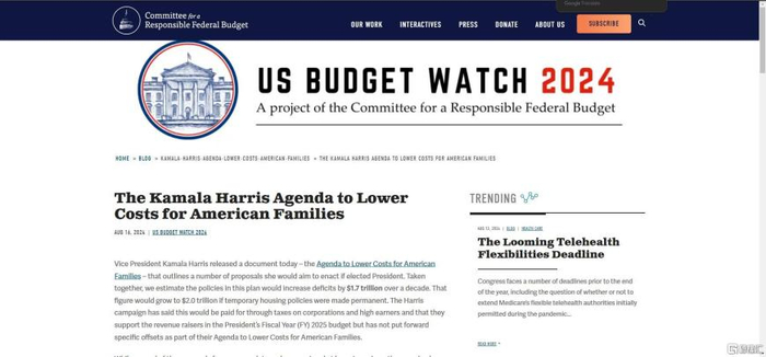联邦预算委员会(CRFB)周五发布的估计显示,哈里斯的一揽子经济计划将在十年内增加1.7万亿美元的赤字。