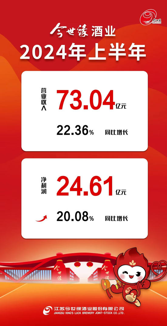 8月16日,江苏今世缘酒业股份有限公司2024年半年报发布:1-6月实现营收73.04亿,同比增长22.36%,净利润24.61亿,同比增长20.08%。营收、净利双双实现20%+增长,不仅体现了今世缘酒业发展的高质量和高成长性,也彰显了企业在复杂的市场环境下更为突出的定力与确定性。
