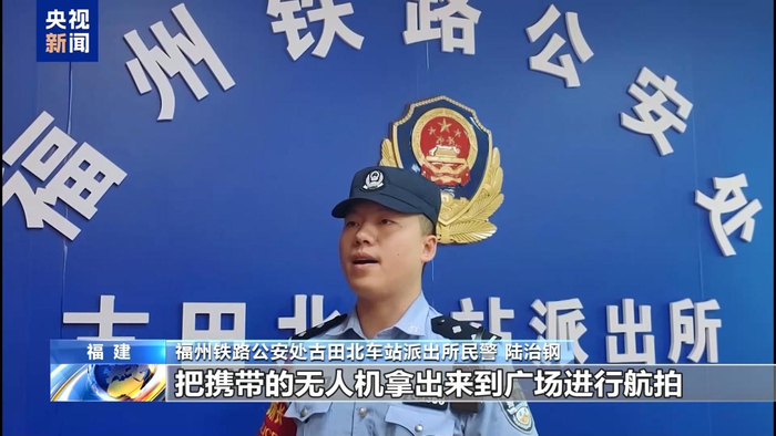 福州铁路公安处古田北车站派出所民警 陆治钢:当时这名男子要到古田北站接亲友,在等待期间他就从车上把携带的无人机拿出来到广场进行航拍。当时无人机已经离电气化铁路线路导线两侧最近的地方不足100米,存在安全隐患。