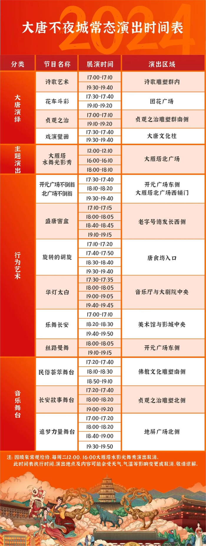 大唐不夜城官方微信近日发布公告,即日起常态化演出时间表更新。该表执行时间、演出地点和内容可能会受天气、气温影响变更或取消,敬请谅解。(来源:大唐不夜城官方)