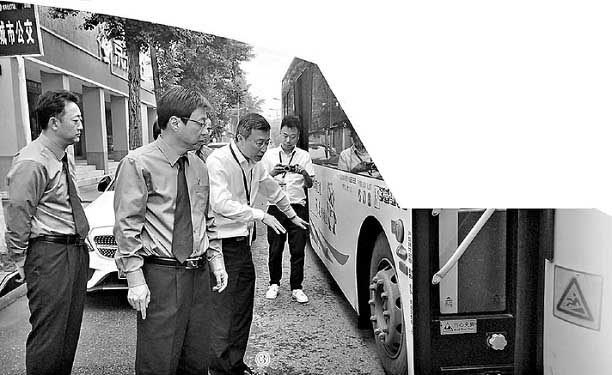 图③:都江堰市检察院检察官在公交公司开展安全生产调研。