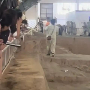 8月17日,有网友在社交平台发布视频称,其在陕西游览秦始皇陵兵马俑时,一女子怀抱孩子突然跨过护栏,走在兵马俑坑的坑道边上。