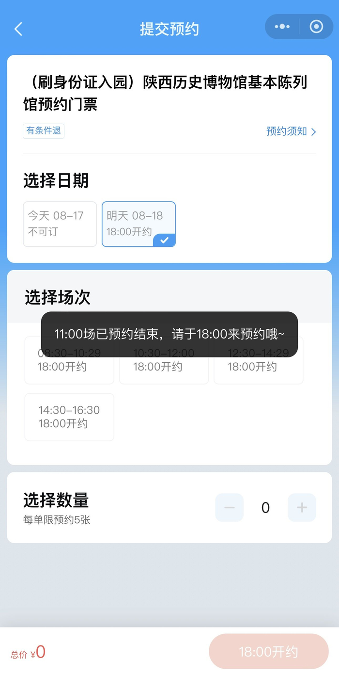 8月17日,记者在上午11时“掐点”进入陕西历史博物馆的小程序预约,门票几乎“秒没”。