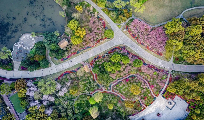 共青森林公园秉持“自然、野趣、宁静、粗犷”的理念,充分利用公园的森林本底植物层次和自然水系、地形等特点,最大限度地运用自然空间进行布局,呈现出“看似林尽水缘处,又是万花丛中来”的独特观赏体验。