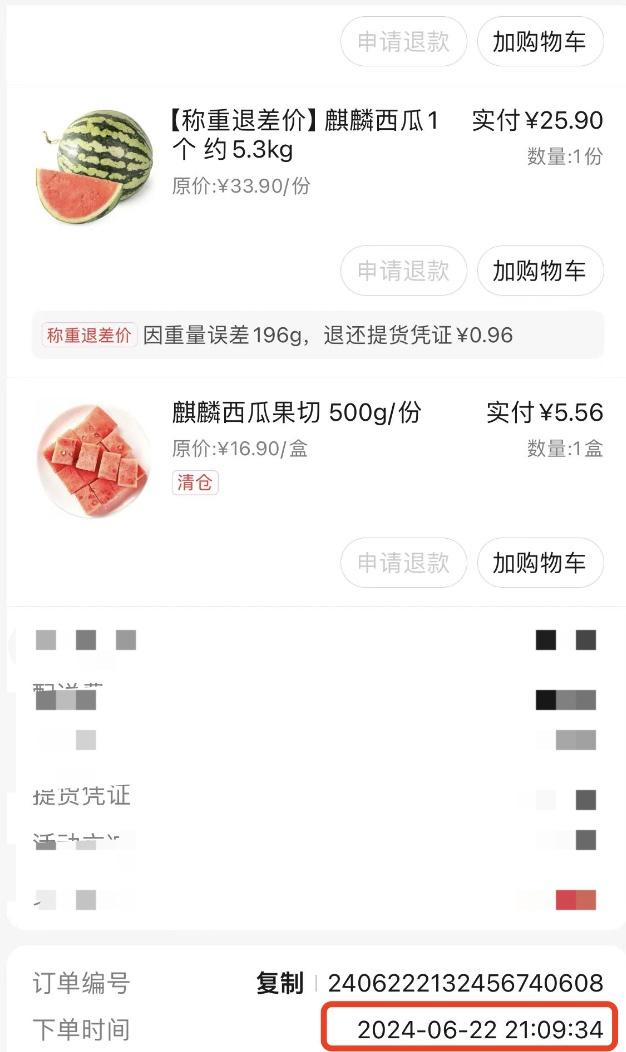 “梅雨时候接近20多块钱就能买一个麒麟瓜,现在还是同样的平台,已经涨到55了……”从她晒出的订单看,在同一平台,今年6月22日下单的约5kg的麒麟瓜实付25.9元。(约2.59元/500克)