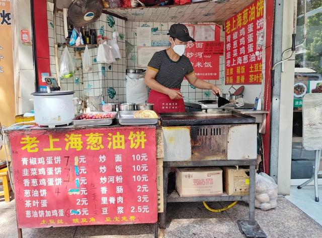 “老板,老样子,一个鸡蛋灌饼夹菜。”环卫工裴阿姨每天上午8点准时打卡这家老上海葱油饼店。她说:“我每天都来吃一个饼,味道挺好,老板也很实在。”