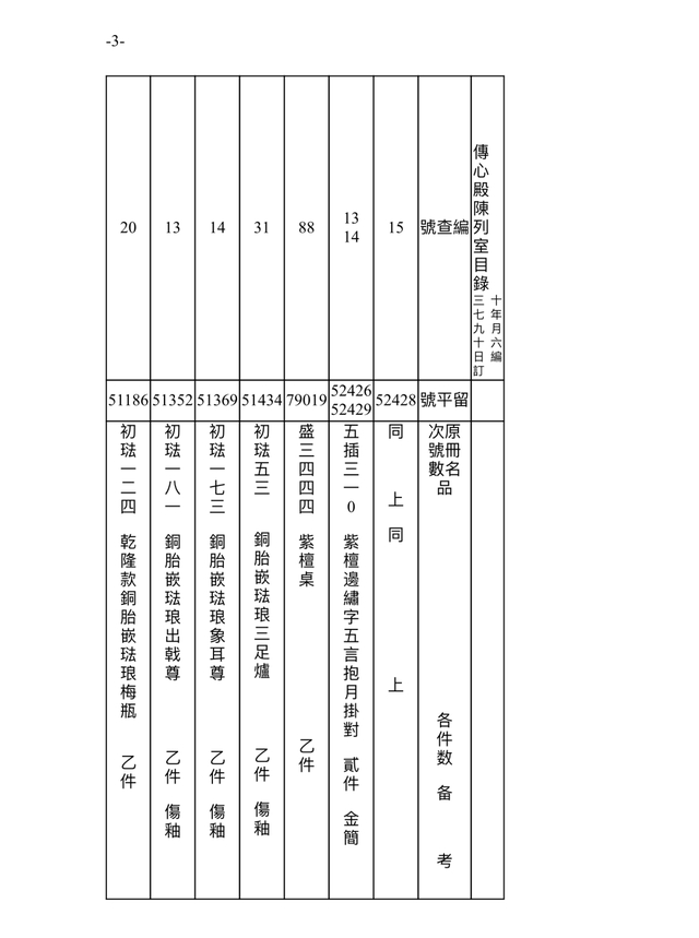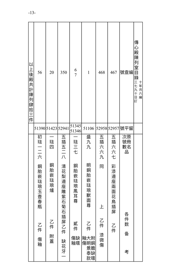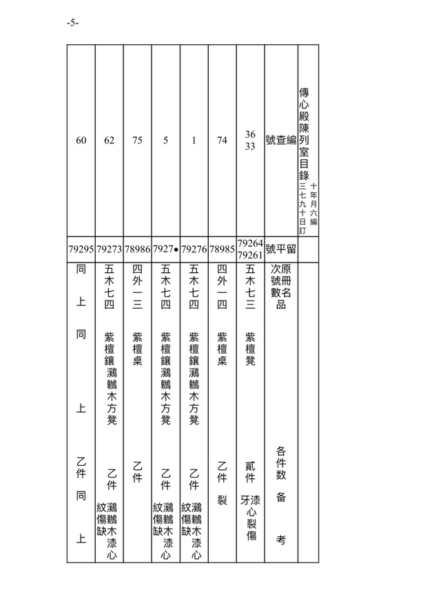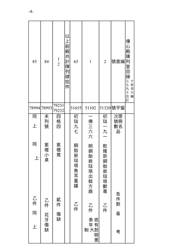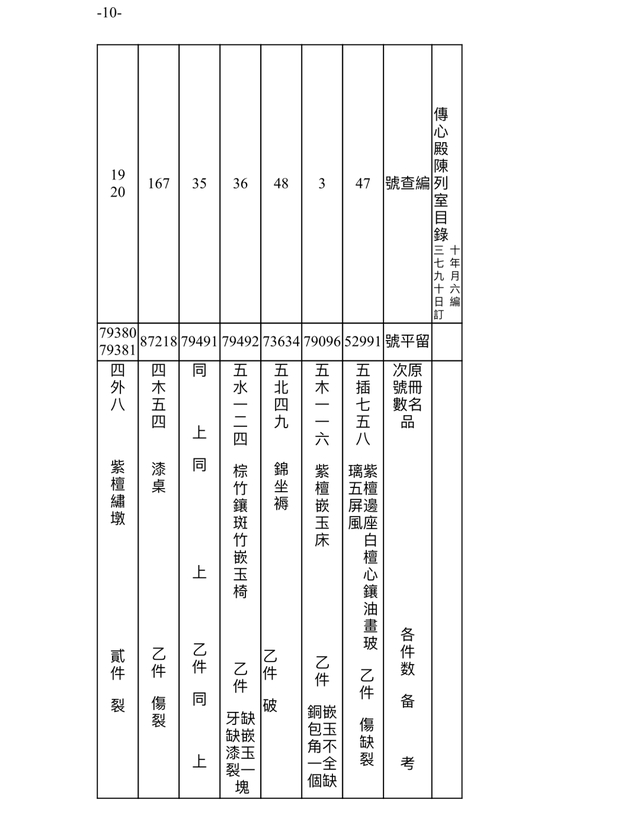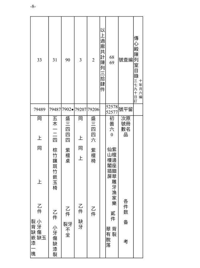 此档案记录时间为民国三十七年(1948)九月十六日(10月18日)。故宫博物院在接收古物陈列所之后,进行的点收,从当年9月1日起,到11月22日结束。根据档案记录,此时的传心殿陈列室,依旧是原状陈列展览,通过“留平”号可辨别一些在陈文物。