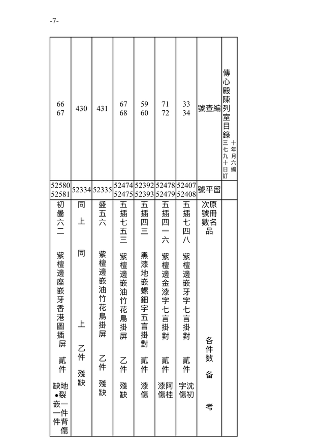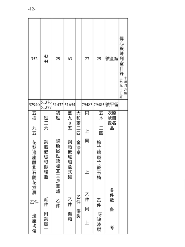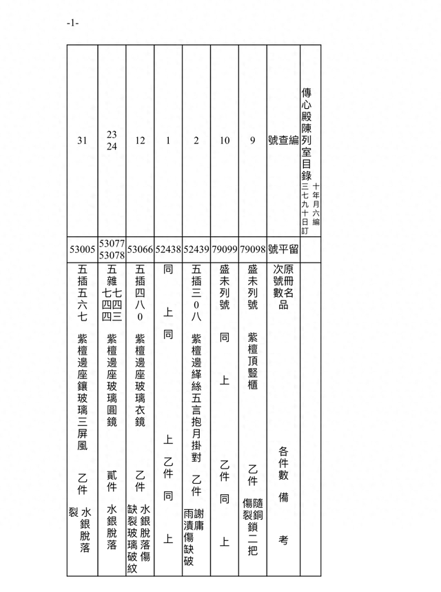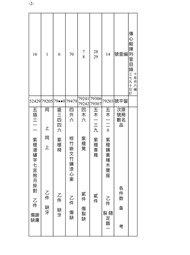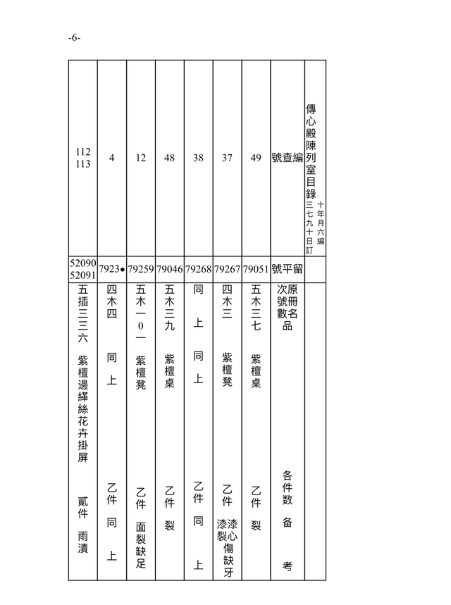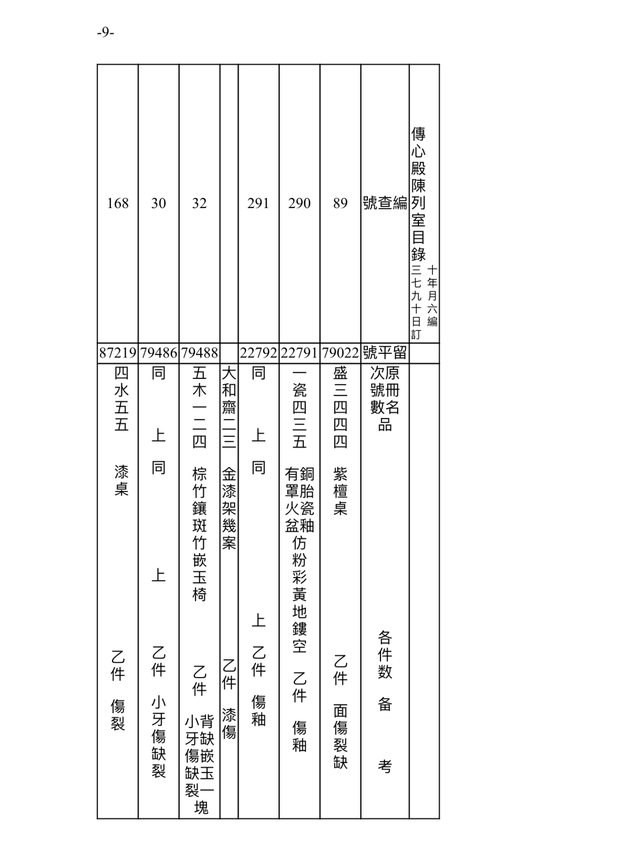 此档案记录时间为民国三十七年(1948)九月十六日(10月18日)。故宫博物院在接收古物陈列所之后,进行的点收,从当年9月1日起,到11月22日结束。根据档案记录,此时的传心殿陈列室,依旧是原状陈列展览,通过“留平”号可辨别一些在陈文物。