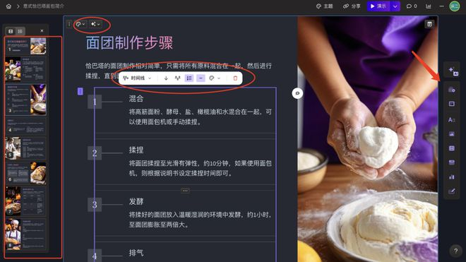然后开始生成,2分45秒之后,我拿到了8节35页的ppt,分别从历史起源、基本食材、面团步骤、工艺技巧、烘烤技术、创新改良、互动答疑、培训建议等几个方面展开。