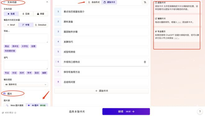 5秒之后,我的8页大纲完成了,也是可以增删更改的,功能区可调整文本内容和图片,文本可调整受众群体和语气,图片也可以选择互联网搜图和ai生图,风格和模型也可选择。