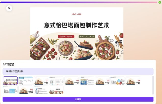 点击-生成PPT,经过20秒的等待我拿到了13页PPT预览,一共由历史文化、制作技巧、烘焙工艺、创意搭配5节组成。