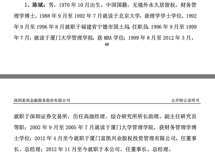 根据麦高控股公告,陈斌出生于1970年10月,曾就职于深圳证券交易所,历任高级经理、综合研究所所长助理、副主任研究员等职;2007年至2009年期间,陈斌曾先后借调到中国证监会发行部、上市公司部工作。2012年11月至今担任麦高控股董事长、总经理。