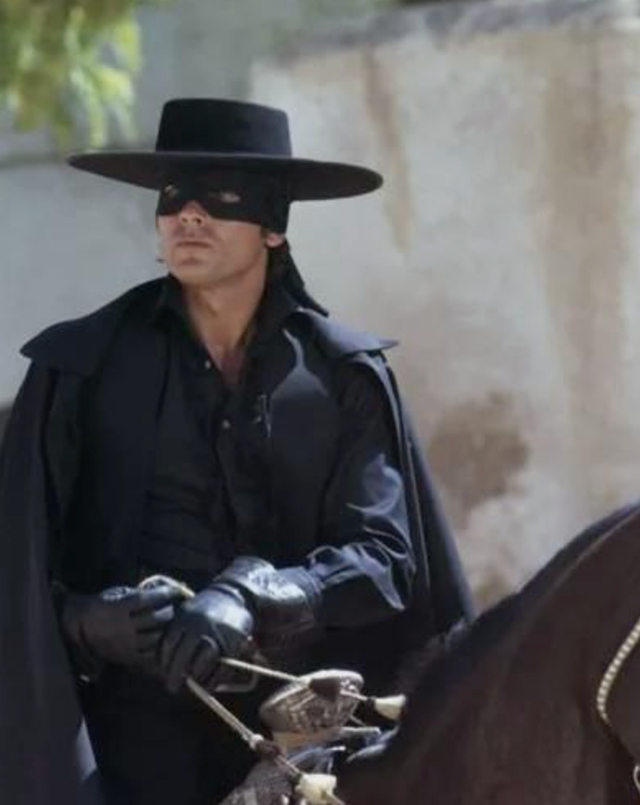 阿兰·德龙最为中国观众所熟知的作品,是1975年的动作片《佐罗》,他在片中扮演了一个剑术高绝,英俊潇洒,惩恶扬善的蒙面大侠。一袭黑色斗篷、一匹枣红坐骑、一条凌空挥舞的长鞭,黑色礼帽下,迷人的微笑绽放出风流倜傥的浪漫气质。