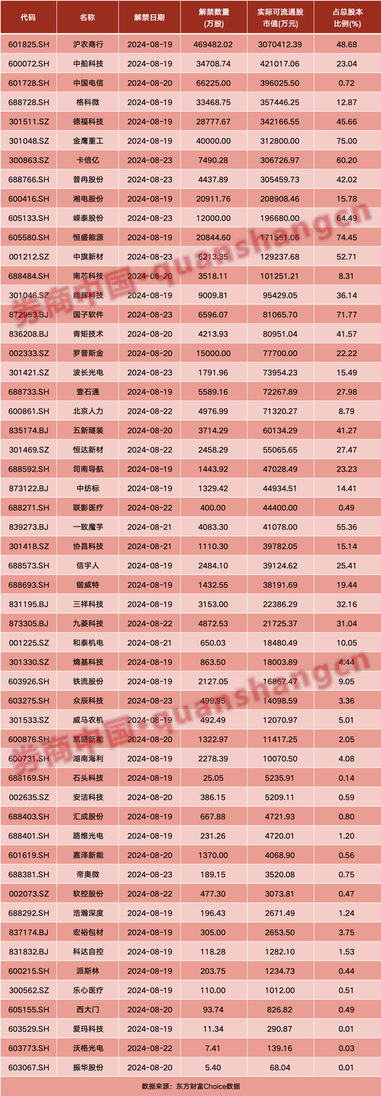 数据显示,本周(8月19日~8月23日)共有54家公司限售股陆续解禁,合计解禁量83.44亿股,按8月16日收盘价计算,解禁市值为746.8亿元。