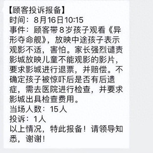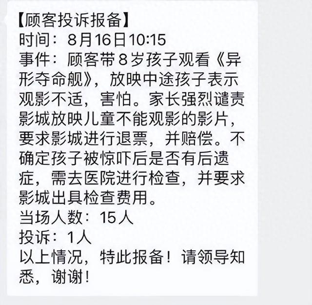 据羊城晚报,某电影院的“顾客投诉报备信息”显示:8月16日,顾客带8岁孩子观看《异形:夺命舰》,放映中途,孩子表示观影不适,害怕。家长强烈谴责影城放映儿童不能观看的影片,要求影城退票,并赔偿。顾客不确定孩子被惊吓后是否有后遗症,需去医院进行检查,并要求影城出具检查费用。