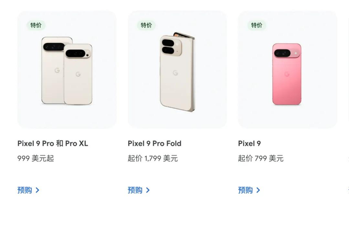 Pixel 9系列手机包括Pixel 9、9 Pro和9 Pro XL手机,以及一款名为9 Pro Fold的高档折叠机型。其中Pixel 9是一款6.3英寸显示屏的基本款,起售价为799美元(约合人民币5717元),比上一代高出100美元。Pixel 9 Pro起售价999美元,Pixel 9 ProXL起售价1099美元,Pixel 9 Pro Fold起售价1799美元。此外,谷歌还发布了两种尺寸的Pixel Watch3和Pixel Buds Pro2。谷歌发言人表示,Pixel 9和配备了更好的摄像头等附加功能的Pixel 9 Pro XL将于8月下旬开始发货,而可折叠的Pixel 9 Pro Fold将于9月发货。
