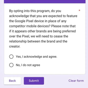 近几天在互联网上,各路博主们纷纷发出了谷歌公司“影响力计划”——Team Pixel的审查协议。上面直白地写着,参与这个计划的网络博主“预期应该使用谷歌Pixel设备替代任何竞争对手的手机设备”,且“如果发现其他品牌的设备优于Pixel,我们将不得不终止品牌与创作者之间的合作关系”。