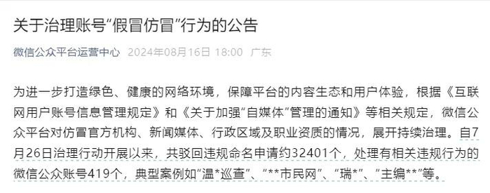 为进一步打造绿色、健康的网络环境,保障平台的内容生态和用户体验,根据《互联网用户账号信息管理规定》和《关于加强“自媒体”管理的通知》等相关规定,微信公众平台对仿冒官方机构、新闻媒体、行政区域及职业资质的情况,展开持续治理。自7月26日治理行动开展以来,共驳回违规命名申请约32401个,处理有相关违规行为的微信公众账号419个,典型案例如“温*巡查”、“**市民网”、“瑞*”、“主编**”等。