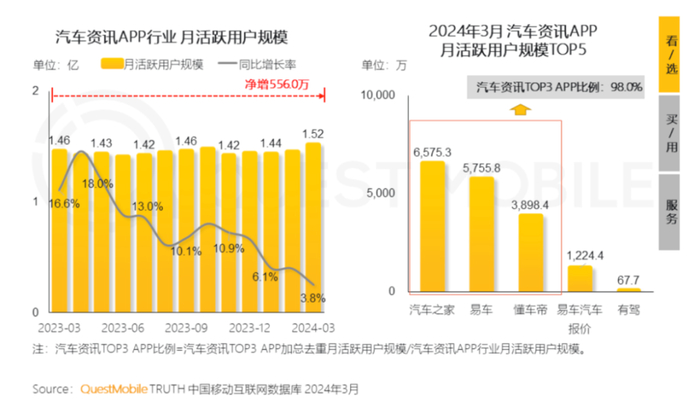 当前,汽车之家的品牌形象和市场地位已经受到了一定程度的冲击。根据QuestMobile披露的数据,汽车之家月活规模为6575.2万,相较2023年12月的6495万,仅增长1.23%。