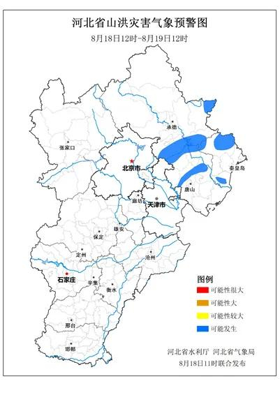预计,8月18日12时至8月19日12时,承德市(平泉市、兴隆县、宽城满族自治县)、秦皇岛市(青龙满族自治县、昌黎县、卢龙县)、唐山市(丰润区、迁西县、迁安市、滦州市、遵化市)等地局地可能发生山洪灾害(蓝色预警)。其他地区也可能因局地短历时强降水引发山洪灾害,请各地密切关注降雨情况,强化山洪灾害监测,及时发布预警信息,提前组织群众转移避险,确保人民群众生命安全。