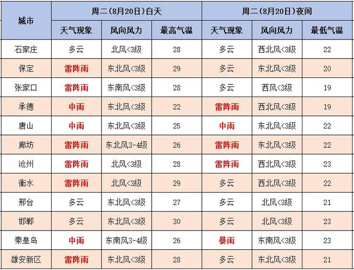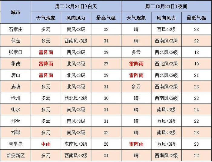今天白天,全省阴,承德南部、唐山、秦皇岛、保定、廊坊、石家庄、沧州、衡水有中雨,部分地区有大雨,个别地点有暴雨,其他地区有雷阵雨或阵雨。最高气温,张家口中北部、承德、秦皇岛北部、保定西北部24~27℃,其他地区28~31℃。今天夜间,全省阴,承德中南部、唐山、秦皇岛、廊坊、沧州东部有中雨到大雨,局地有暴雨,其他地区有分散性雷阵雨或阵雨。最低气温,张家口北部、承德北部、保定西北部14~18℃,其他地区19~24℃。明天白天到夜间,全省阴,承德中南部、唐山、秦皇岛、廊坊北部有大雨,部分地区有暴雨,个别地点有大暴雨,其他地区有小雨到中雨。21日白天到夜间,北部地区阴有雷阵雨或阵雨,其他地区阴转多云。