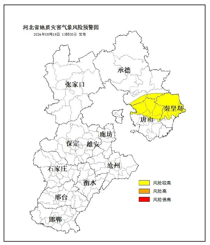 自08月18日14:00至08月19日14:00,我省承德市(宽城满族自治县、兴隆县)、唐山市(迁西县、遵化市、迁安市、丰润区、滦州市、玉田县、开平区、古冶区)、秦皇岛市(卢龙县、山海关区、昌黎县、青龙满族自治县、抚宁区、海港区、北戴河区)发生崩塌、滑坡、泥石流等地质灾害风险较高(黄色预警)。请上述地区各级政府及有关部门按照应急预案做好地质灾害防御工作。请社会公众及时关注地质灾害气象风险预警信息,谨慎前往地质灾害预警区域。预警区内人员,请随时关注预警信息变化,注意附近警示标志,避免在沟谷、斜坡、陡崖(坎)等高风险地带逗留。