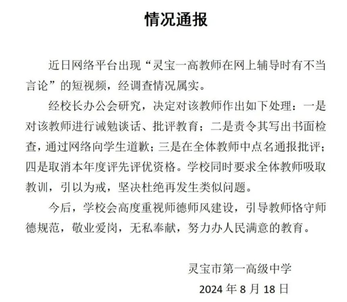 近日网络平台出现“灵宝一高教师在网上辅导时有不当言论”的短视频,经调查情况属实。