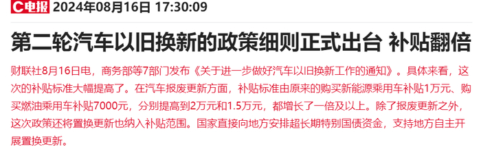 消息方面,8月16日,商务部等7部门发布《关于进一步做好汽车以旧换新工作的通知》。具体来看,这次的补贴标准大幅提高。在汽车报废更新方面,补贴标准由原来的购买新能源乘用车补贴1万元、购买燃油乘用车补贴7000元,分别提高到2万元和1.5万元,都增长了一倍及以上。
