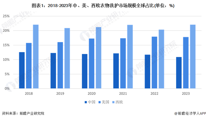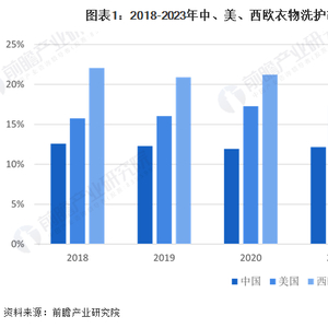 从2018年到2023年,全球衣物洗护市场规模的区域占比显示,中国、美国和西欧市场份额没有明显的变化,中国市场占比总体出现一定的下降,从2018年的12.6%降至2023年的10.9%,这可能与中国国内市场相对饱和、竞争加剧以及消费者需求变化等因素有关。然而,美国市场占比略有上升,五年时间增加了2.04个百分点,表明美国市场在洗护产品消费上依旧有活力。西欧市场有一定的波动较大,这种波动可能反映了西欧市场的稳定需求和市场策略调整。总体来看,不同地区的市场需求和消费习惯存在差异,需要针对性策略。
