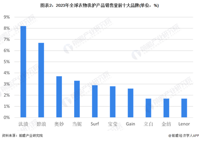 2023年全球洗衣用品销售量前十大品牌中,宝洁公司和联合利华集团占据主导地位,汰渍、碧浪、当妮、Gain、Lenor都是宝洁旗下,奥妙、Surf和金纺是联合利华旗下,宝莹和立白分别是汉高和立白集团旗下产品,中国前十仅立白上榜,排名第8,雕牌和蓝月亮系列产品在第14、15位。但从面板上看,各品牌市场份额的细微变化反映出竞争的激烈和市场动态的变化。