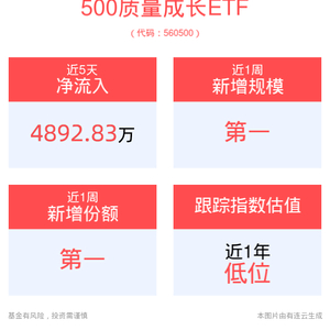 规模方面,500质量成长ETF近1周规模增长4476.64万元,实现显著增长,新增规模位居可比基金第一。份额方面,500质量成长ETF近1周份额增长6100.00万份,实现显著增长,新增份额位居可比基金第一。