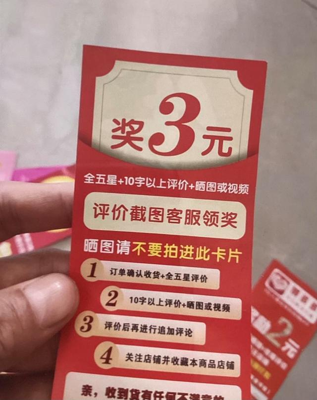 经常网购的市民应该不陌生,每次拆开快递包裹后,里面除了购买的商品以外,往往还会附上一张小卡片,上面印有诸如“带图10字以上,点亮5星,赠送感谢金×元”的字样。制售卡片的商家称:90%商家都在用。
