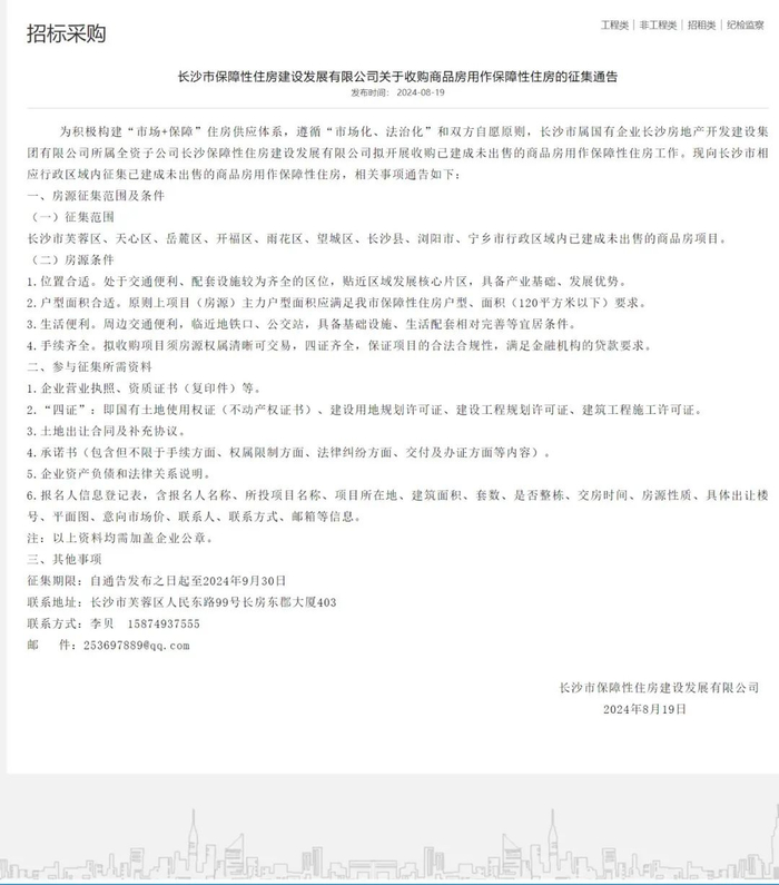 今日,备受市场瞩目的长沙收购商品房用作保障性住房工作迎来积极进展。8月19日,长沙市保障性住房建设发展有限公司发布关于收购商品房用作保障性住房的征集通告。