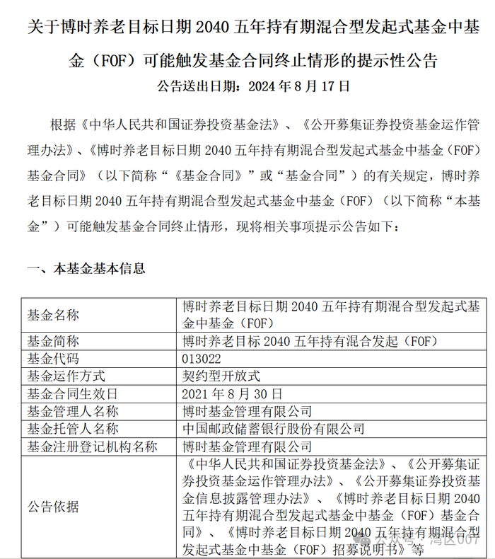 8月17日,博时基金宣布其管理的三只养老目标日期FOF基金可能面临合同终止的风险,并已暂停相关申购和定期定额投资业务。
