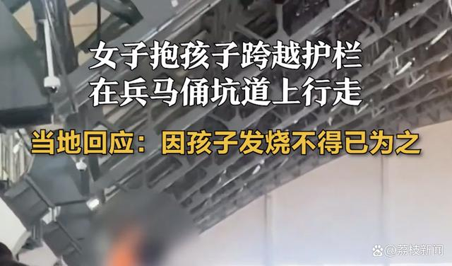 近日,一则视频在网上广泛传播:在秦始皇帝陵博物院,一女子怀抱孩子突然跨过护栏,走在兵马俑坑的坑道边上。该女子最终被保安带离。随后,西安市临潼区权威部门回应称,事发当天景区附近降雨,女子怀中的小孩被雨淋湿后发烧抽搐,“孩子出现这种情况后家长特别着急,一号坑内游客特别多,她也一时出不去,情急之下就进去了。”事后保安并未阻拦女子,在询问完情况后,赶紧让家长把孩子送去救治。