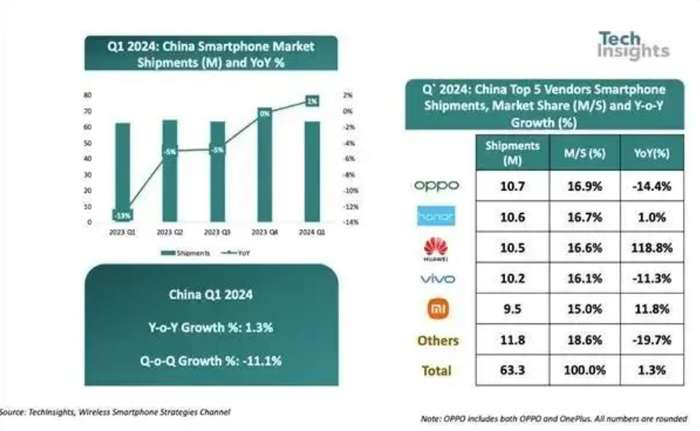 其一,iPhone 16产能需要。按照惯例,iPhone 16将在今年9月份面世。市场调研机构TechInsights发布的数据显示,2024年一季度,在头部厂商排名中,苹果以13.7%的市场份额跌出了前五名。同期,华为出货量同比大幅增长118.8%,市占率排第三。
