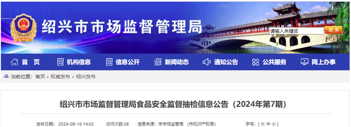 浙江省绍兴市市场监督管理局食品安全监督抽检信息公告(2024年第7期)