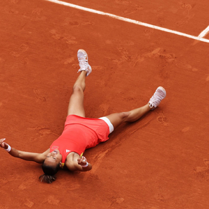 郑钦文稍稍减速,丢下球拍,躺倒在红土球场,双手握拳嘶吼着庆祝自己的胜利。