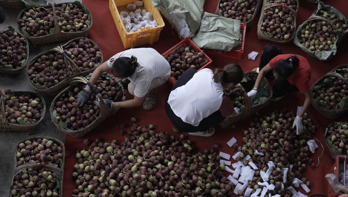 新鲜的无花果会有专门的女工负责处理:分拣、套袋、装筐……中午时分,统一装车,拉到熊亚军的仓库,然后再分装、封箱,发往全国各地。