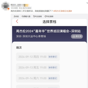 19日13时,周杰伦2024年“嘉年华”世界巡回演唱会深圳站开始第二轮开票。然而刚放票,便有不少网友表示“秒没”“完全抢不到”,随后#周杰伦演唱会抢票#话题登上微博热搜高位。