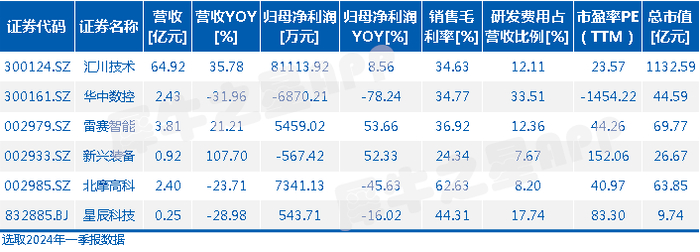 同行业上市公司方面,选取汇川技术(300124)、华中数控(300161)、雷赛智能(002979)、新兴装备(002933)、北摩高科(002985)为可比公司。星辰科技营收规模与同行业上市公司相比还有较大提升空间,但公司毛利率处于行业第一梯队,仅次于北摩高科;在研发投入方面也显著高于同行业公司,2024年Q1研发费用占营收比例达17.74%,仅次于华中数控。鉴于公司在民用市场的持续拓展,以及市场占有率的逐步提高,公司的整体业绩水平、营收规模、盈利能力和品牌影响力预计将会显著增强,并带动其市值实现可观的增长。