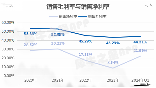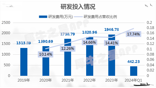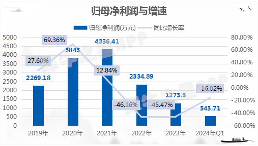 归母净利润方面,2019-2021年公司归母净利润逐年增长,在2021年达到4336.41万元的高峰后回落,2022-2023年连续两年负增长;2024年Q1公司归母净利润为543.71万元,同比下降16.02%,降幅收窄。