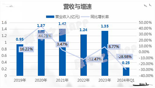 公司营收较为稳定,从2019年的0.95亿元增长至2023年的1.35亿元,CAGR为9.2%;2024年Q1营收为0.25亿,同比下降28.98%。
