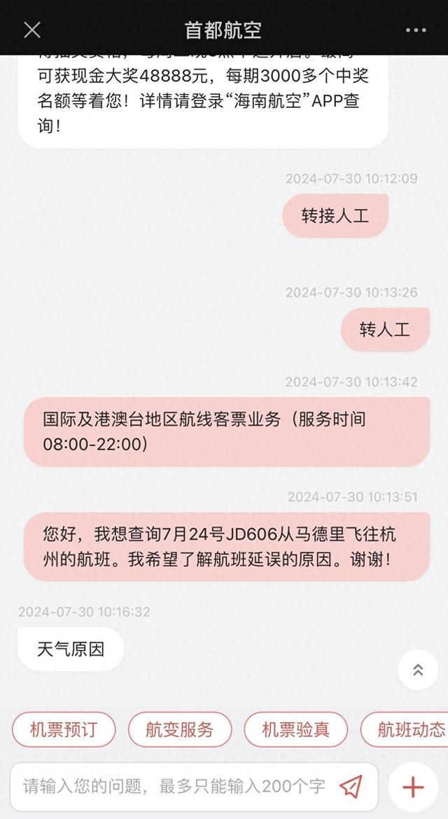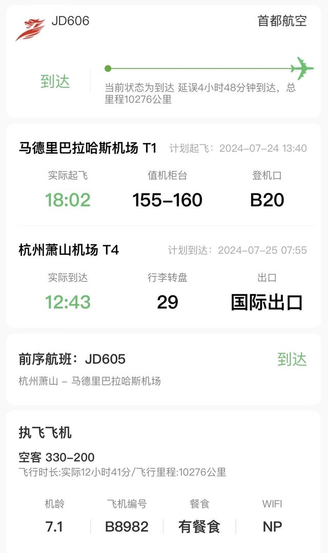陈先生介绍,7月24日,他搭乘首都航空JD606航班,从西班牙马德里巴拉哈斯机场飞往杭州萧山机场,航班原计划北京时间当天13时40分起飞。
