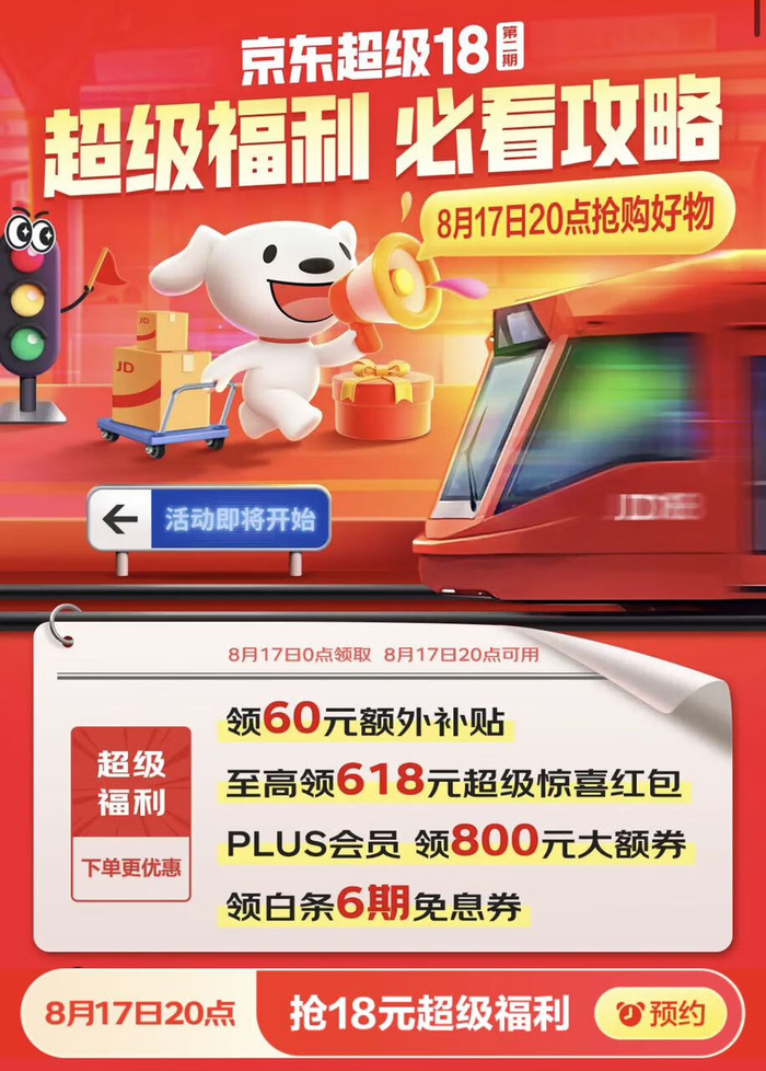 除上述特色玩法外,活动期间,消费者打开京东APP搜索“超级18”进入会场,还可领取60元额外补贴、至高618元超级惊喜红包及白条6期免息券,京东PLUS会员更可领800元大额券。