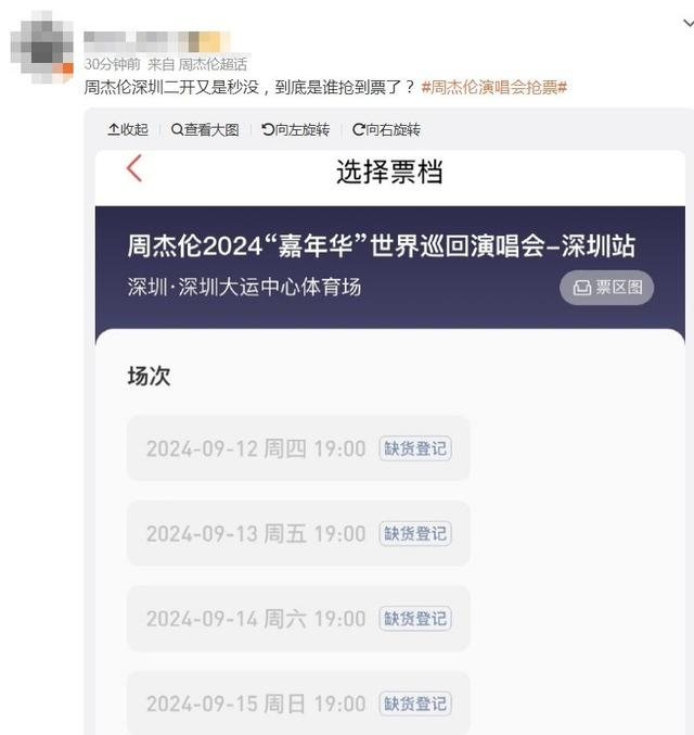 19日13时,周杰伦2024年“嘉年华”世界巡回演唱会深圳站开始第二轮开票。然而刚放票,便有不少网友表示“秒没”“完全抢不到”,随后#周杰伦演唱会抢票#话题登上微博热搜高位。